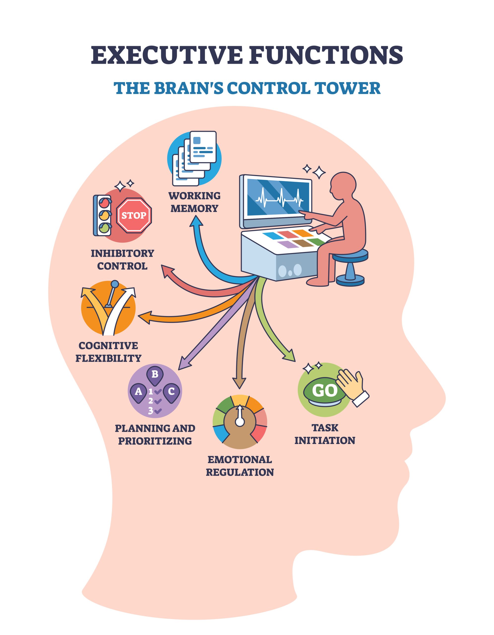 Executive functions skills (EF) are a set of cognitive skills that help us manage our everyday life. They are based in the brain’s prefrontal cortex and act as the brains management system; sometimes referred to as the CEO of the brain.